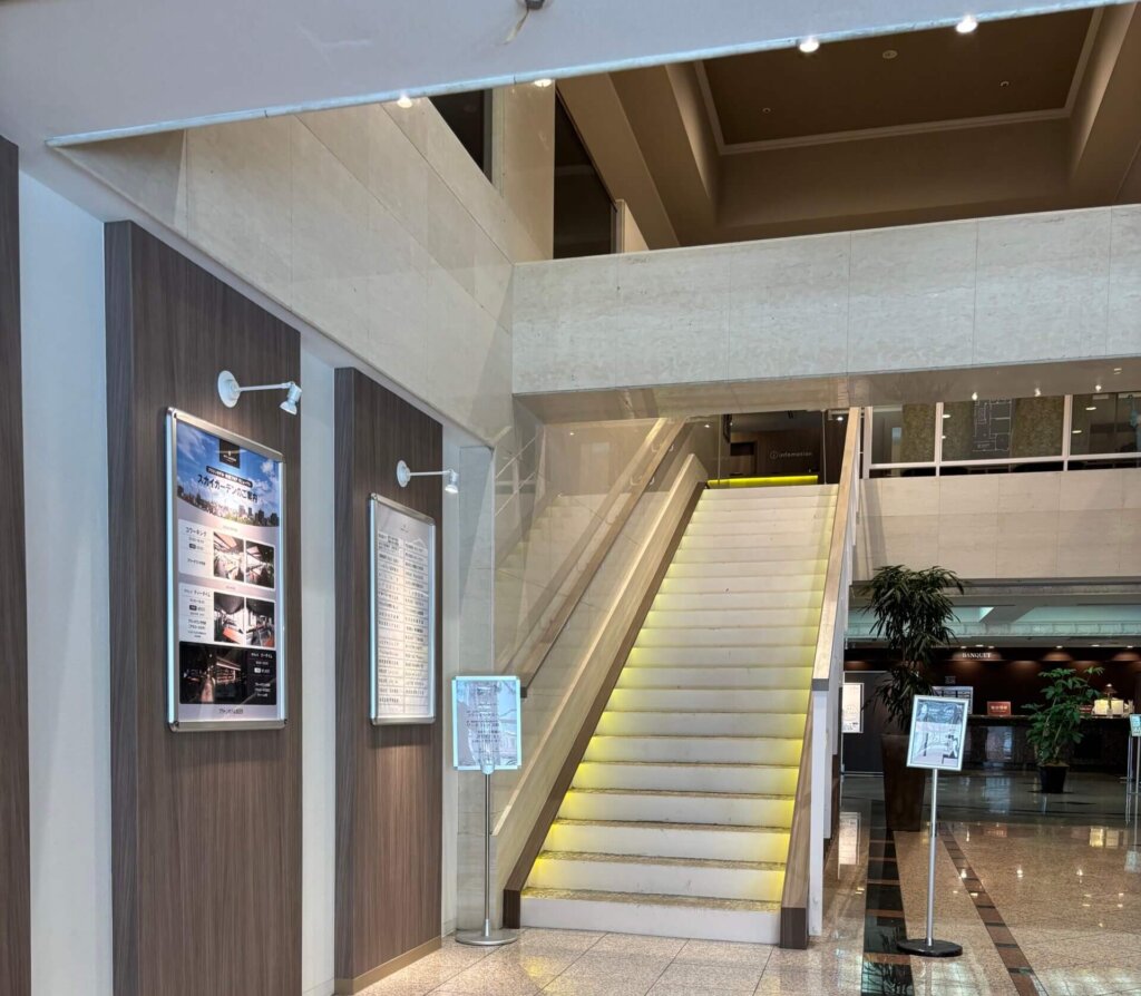 ● ロビーフロアの左側の階段を上り、受付にどうぞ